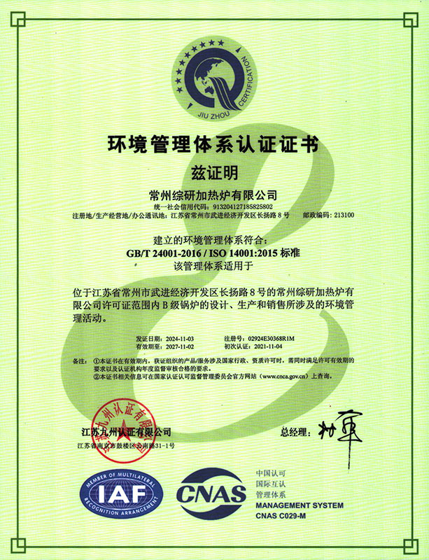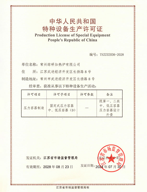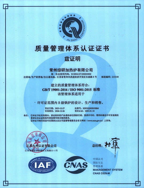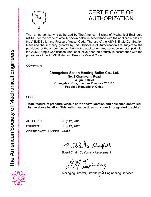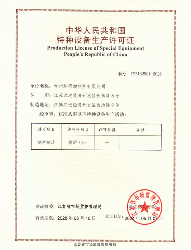 常州综研恪守“质量优先、客户至上”的经营理念,致力于为客户提供安全可靠、性能优异的锅炉、热载体炉及压力容器产品。为此,公司建立并严格实施了完善的质量保证体系及质量、环境、职业健康与安全管理体系。现拥有B级锅炉制造许可证、D级压力容器制造许可证,以及美国机械工程师协会(ASME)“U钢印”和“S钢印”产品制造授权资质,具备了国内、国际市场准入资格。通过了质量、环境、安全和职业健康管理体系认证,从研发、生产到服务全流程践行标准化管理,保障产品质量与可持续发展。